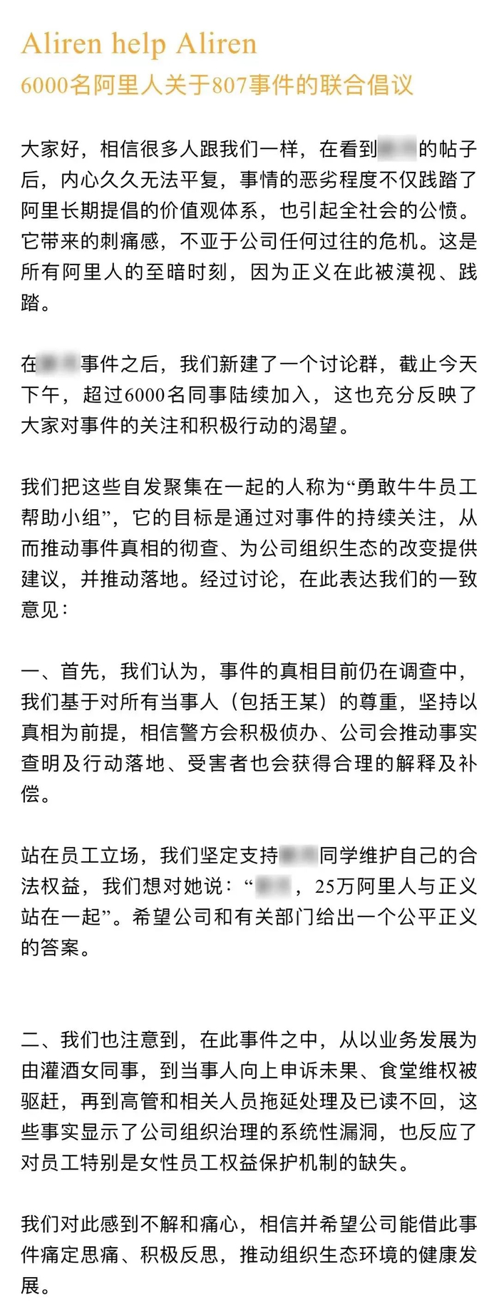 另外,8月8日晚,小编注意到,有一封名为《Aliren help Aliren,6000名阿里人关于807事件的联合倡议》在社交媒体中转发。倡议书中提到,阿里巴巴员工自发建立了一个讨论群,名为“勇敢牛牛帮助小组”,该小组称将借此事件,推动员工、特别是女性员工职场反性骚扰/反性侵制度的建立。