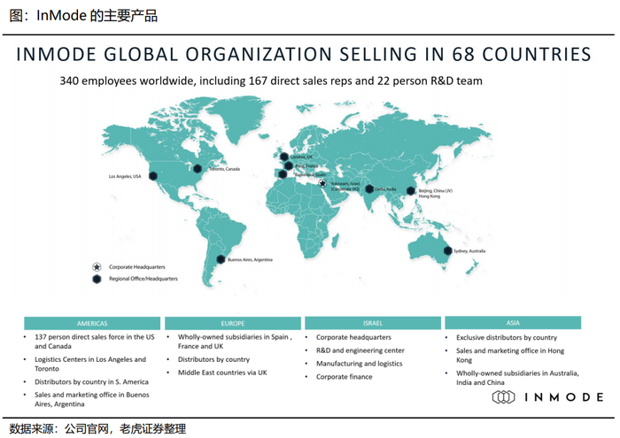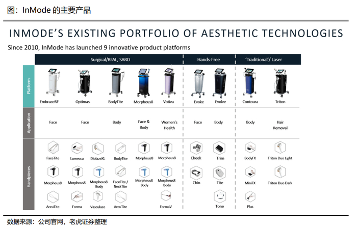 InMode就是一家来自以色列的设计、开发、制造并销售微创美容医疗产品的上游公司,成立于2008年。与其他填充式的医美产品公司不同,InMode开发了差异化的创新技术,填补了传统医美手术与无创手术之间的空白。其主要产品以及研究方向是无创(微创)的医美器械,包括(面部)抗衰老、(身体)减脂、皮肤管理以及脱毛。