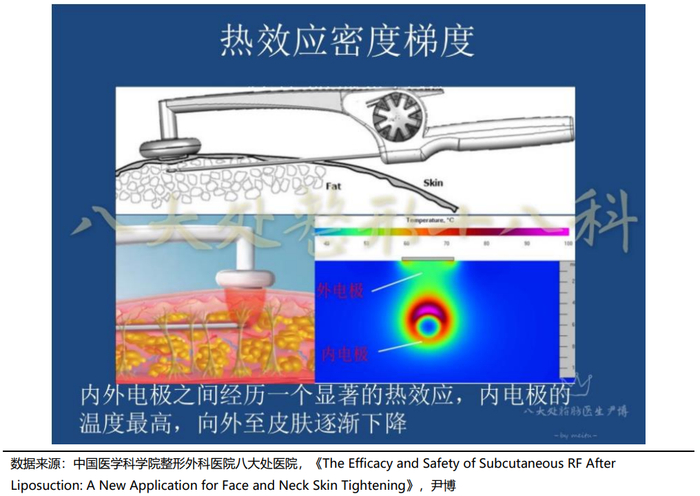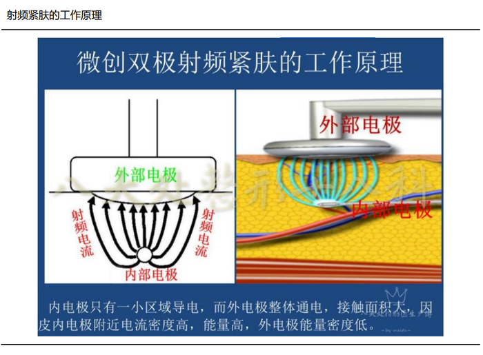 射频,简单来说,就是一种高频交流变化电磁波。射频除皱的原理是通过操控射频波穿透表皮基底黑色素细胞的屏障,使真皮层胶原纤维加热至55℃-65℃,胶原纤维收缩,使松弛的皮肤皱纹被拉紧,同时刺激真皮层胶原蛋白增生、增强皮肤弹性,从而达到去皱紧肤的目的。射频是一种非侵入式的治疗方式,有可能是目前最为安全有效的去皱紧致方法之一。