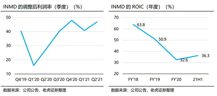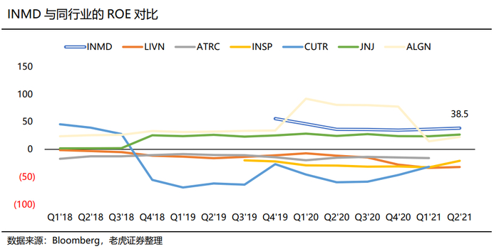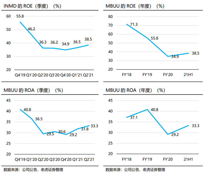 从投资回报的角度看,由于没有负债,且资产质量极高,且利润可观,InMode是一家回报率极高的公司。公司2018-2020财年以及2021年上半年的ROE分别为71.3%、55.8%、34.9%和38.5%,且按单季来看也一直维持在34%以上。ROA变化趋势与ROE类似。