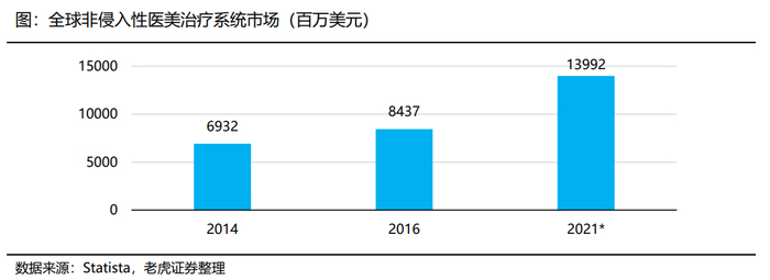 医美市场巨大,且增速快,非侵入式产品需求增长快。医美行业的美容皮肤科需求最大,发展最为迅猛,非手术类项目广受关注。报告显示,全球医美市场规模稳定增长,2019年,全球市场规模达1459亿美元。未来全球医美行业预计保持7%左右的增速,2022年市场规模将达到1782亿美元(不考虑疫情)。