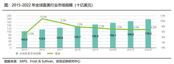 根据德勤此前的行业报告,2015-2019年全球医美市场规模稳定增长,年复合增长率约为8.2%。2019年,全球市场规模达1,459亿美元,同比增幅7.5%。未来,全球医美行业预计保持7%左右的增速,2022年市场规模将达到1,782亿美元(不考虑新冠疫情影响)。