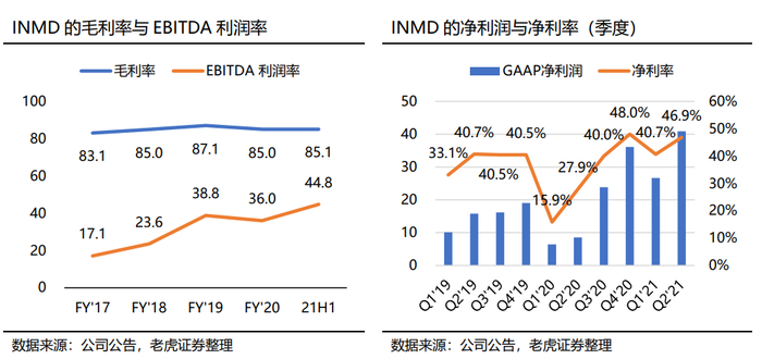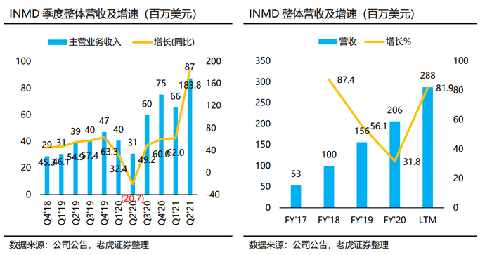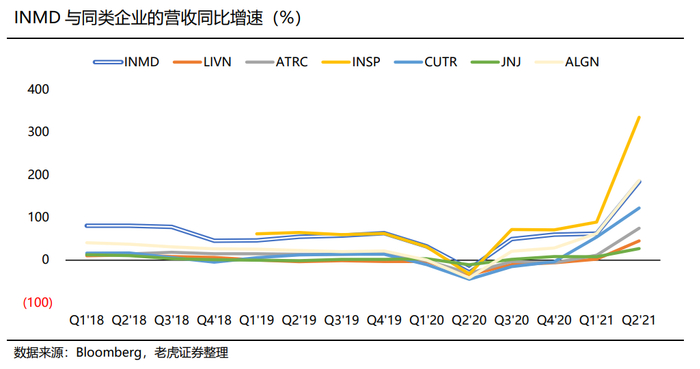 InMode的财务数据极其优秀。20财年获得营收2.06亿美元,同比+31.8%。除了20Q2,19年以来的单季增速都大于40%。21Q2单季营收8700万美元,同比+183.8%,19年来的两年平均年化同比+50.0%。