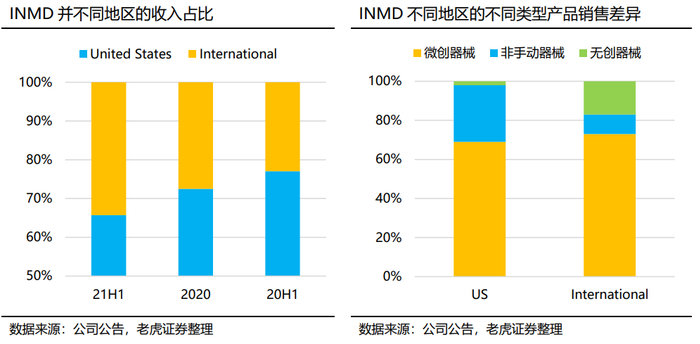 公司主要销售在美国,但国际化推进也进展顺利,在美国以外的不同地区占比不断提升,从2020年上半年的23%提升至21年上半年的34%。得益于当家产品的销售,微创产品的占比在不断提升,占比从前一年的58%提升至21年Q2的71%。此外,公司在国际市场上更倚重微创和无创医械的销售。