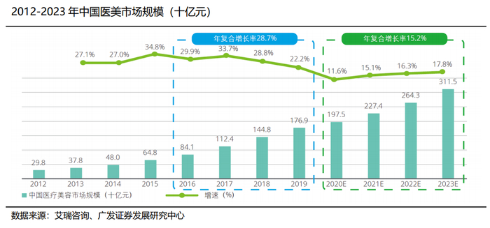 2020年-2023年的年复合增长率预计降为15.2%。但艾瑞咨询同时预测,预计行业经过3-5年的行业自我调整和变革后,市场将逐步回暖,2023年中国医疗美容市场规模将达到3115亿元。