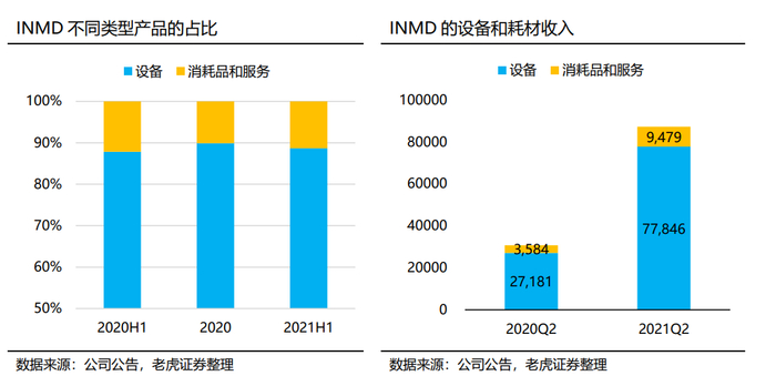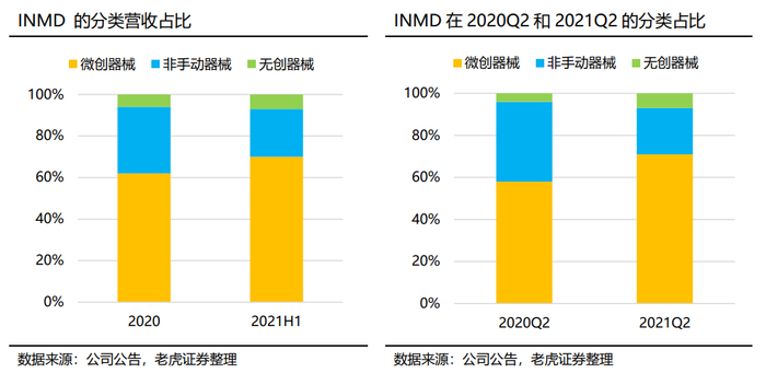三类产品的营收比例,在2020年为别为62%、32%和6%,其中微创产品在2020年上半年达到了70%,无创器械也上升到7%。微创产品的占比在不断提升,还是得益于主当家产品的销售,21年Q2的微创产品占比从前一年的58%提升至71%。