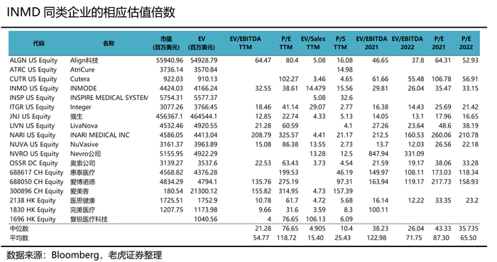 我们以相应的医疗器械上市公司行业的公司作为同业对比公司,与InMode进行对比。