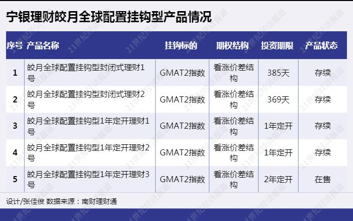 目前,宁银理财发行了5只“皎月”全球配置挂钩型理财产品,其中封闭式产品有2只,定期开放式产品有3只。无论是封闭式还是开放式,产品单个投资周期均不小于一年,挂钩标的均为中信证券大类资产趋势2.0指数(GMAT2.WI),期权结构为牛市看涨价差。