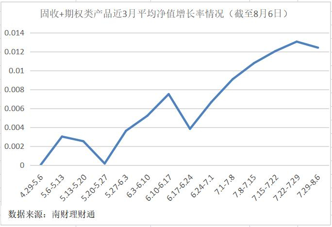 据南财理财通数据显示,理财子公司“固收+期权”类产品近3月平均净值增长率呈震荡走高态势。截至7月29日-8月6日该周,理财子公司“固收+期权”产品近3个月平均净值增长率较基期上涨1.2400%,近3个月平均波动率较基期上涨0.2150%。