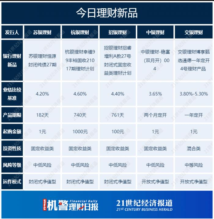 据南财理财通数据显示,理财公司近期推出的理财产品以固定收益类产品为主,其中交银理财“博享甄选通德一年定开4号理财产品”值得关注。该产品业绩比较基准为3.80%-5.30%,通过专业的多元资产管理团队稳享波动资产收益,当波动资产表现均不佳时通过低波资产获得相对稳定的收益。波动资产层面,主要采用目标风险策略来进行大类资产配置。基金投资层面,通过定量和定性相结合的方法,精选具有不同风险收益特征及投资业绩比较优势的基金。认购起点为1元,募集期从8月6日至8月16日。