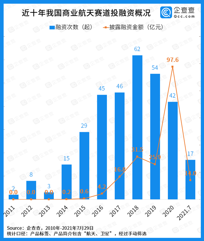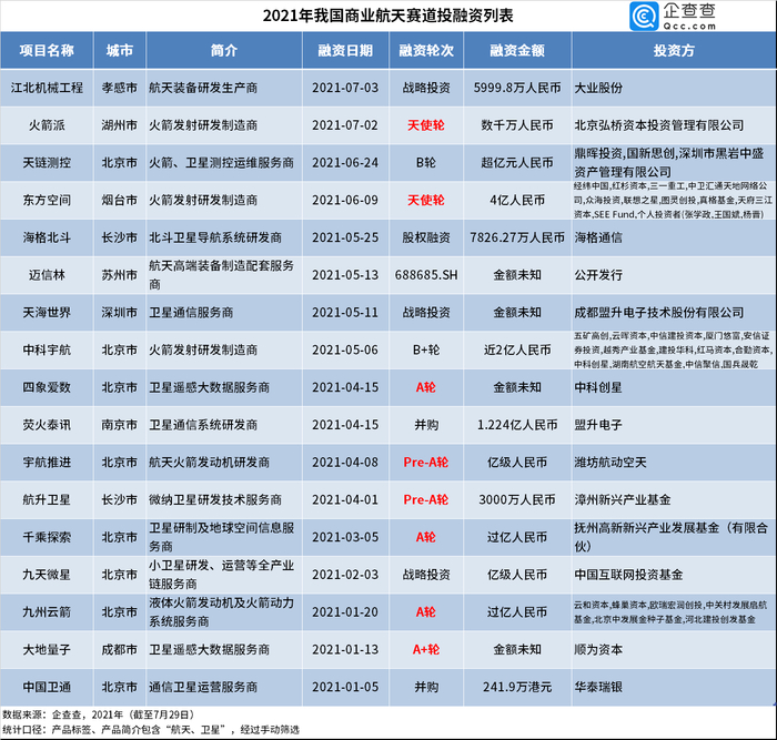 二、2021年商业航天赛道融资仅17起,火箭、卫星研发初创企业频获融资