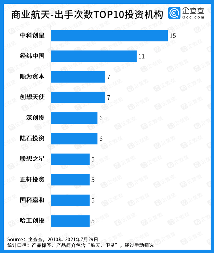企查查数据显示,从出手次数来看,中科创星以15次出手位列第一,曾两次加码“九天微星”和“微纳星空”,独立投资了“坤飞航天”、“天擎航天”等多个项目,所投项目布局主要集中火星、卫星发射研发企业,以及卫星遥感数据应用企业。