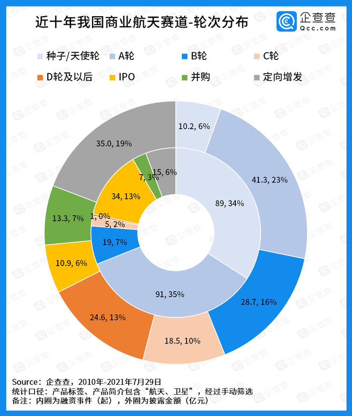 聚焦于近十年商业航天项目的融资轮次分布(不统计战略融资、股权融资),饼图内圈为融资数量分布,饼图外圈为融资金额分布。企查查数据显示,早期融资(种子/天使轮-B轮)的数量有199起,占比高达76%;而早期融资的披露金额仅有80亿元,占比仅有44%。