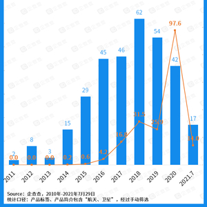 通览过去十年我国商业航天赛道的融资情况,企查查数据显示,融资事件数量从2015年起开始翻倍,从15起上升至29起;2016-2017年实现第二次跳跃,达到45起、46起;2018年为历年第一高,达到62起;2019-2020年出现回落,但仍保持在40起以上。2021年1-7月商业航天项目融资事件共17起,或为新低谷。