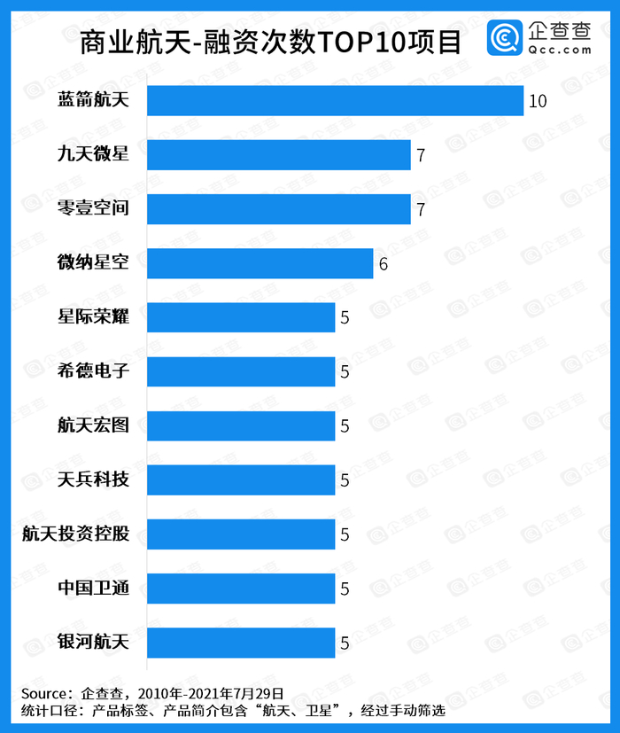 企查查数据显示,从融资次数来看,蓝箭航天以10次位列第一,九天微星与零壹空间以7次并列第二。