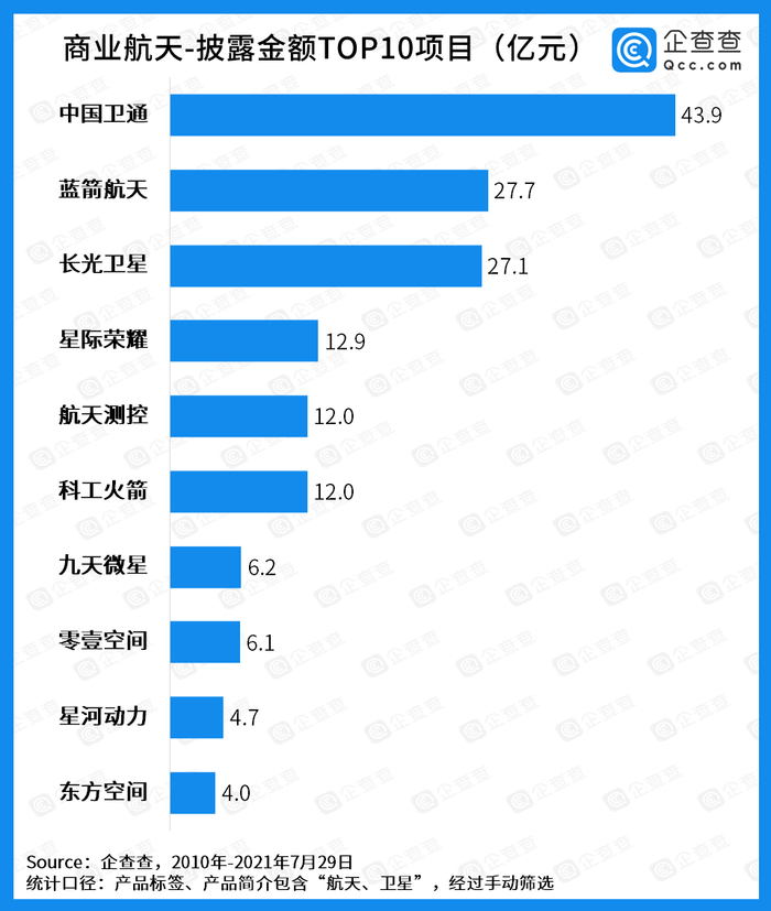 企查查数据显示,从披露金额来看,中国卫通以43.9亿元摘得魁首,而蓝箭航天与长光卫星分别以27.7亿元、27.1亿元位列第二三名。