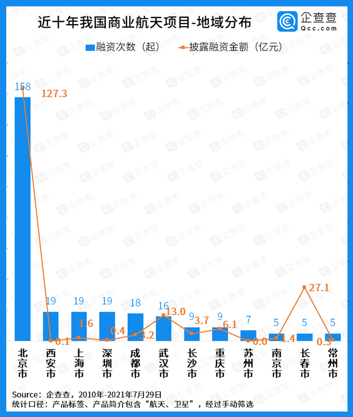 企查查数据显示,从商业航天项目的地域分布来看,北京共发生了158起融资,其次是西安、上海和深圳,各有19起。