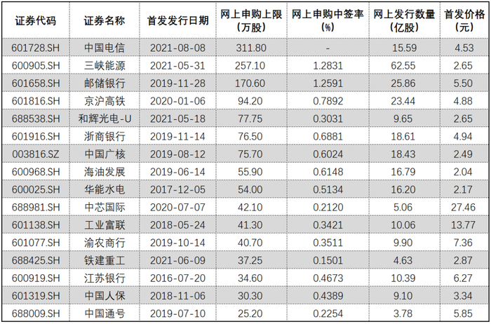 此前,顶格申购上限数量最多的是今年5月发行的三峡能源(600905),顶格申购上限为257.1万股,中签率是1.2831%;其次是2019年11月底发行的邮储银行(601658),顶格申购上限为170万股,中签率是1.2591%。
