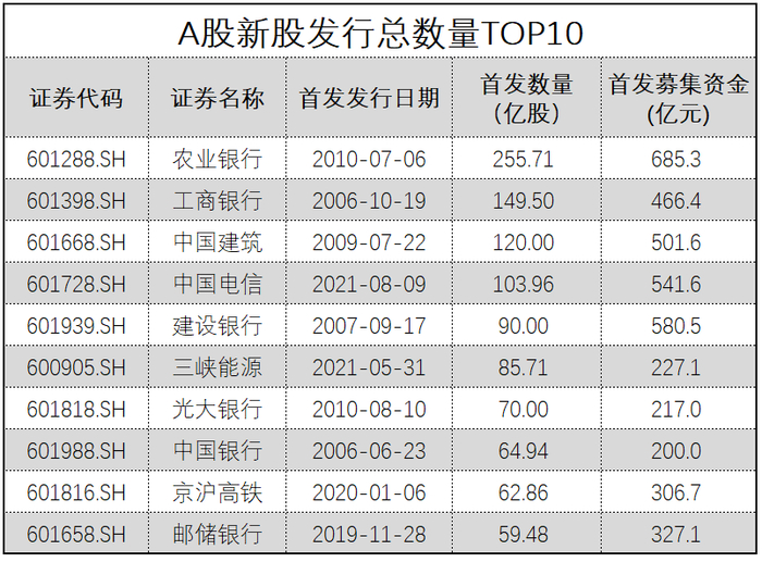 值得一提的是,此次中国电信发行总数高达103.96亿股(超额配售选择权全额行使前),直接跻身A股发行数量榜的第4位,更是近11年以来新股发行数量最多的上市公司。据数据显示,高居A股新股发行数量榜首位的是农业银行,发行总数高达255.71亿股,工商银行紧随其后,发行总数达149.5亿股。