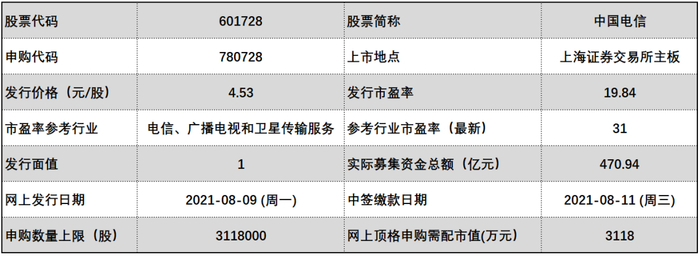 根据新股发行安排,“巨无霸”中国电信将于今日(8月9日)正式启动网上申购,网上申购代码为780728,发行价格为4.53元/股,网上申购数量上限高达311.8万股,顶格申购需要沪市市值3118万元,是新股申购规则以来顶格申购上限最高的新股,也或将成为A股最容易中签的新股。