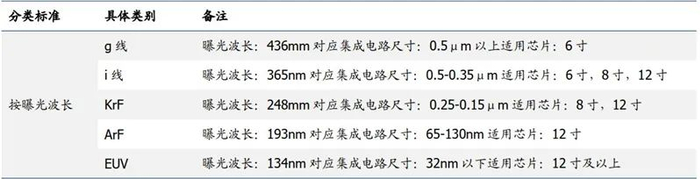 从光刻胶的发展历程看,从 20 世纪 50 年代至今,光刻技术经历了紫外全谱(300-340nm),G 线(436nm),I 线(365nm),深紫外(Deep Ultraviolet,DUV,248nm 和 193nm),以及目前最引人注目的极紫外(EUV,13.5nm)光刻,电子束光刻等六个阶段,随着光刻技术发展,各曝光波长的光刻胶组分(成膜树脂、感光剂和添加剂等)也随之变化。