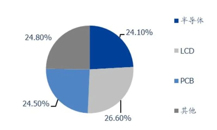 从光刻胶全球市场来看,根据 Cision 的统计,2019 年约有 91 亿美元的市场规模,且至2022 年预计将达到 105 亿美元,实现复合增长 5%。而其中半导体、LCD、PCB 这三类主要的应用场景分别占据了市场空间的 24.10%、26.6%、及 24.5%,分别对应 2019年的市场规模 22 亿美元、24 亿美元、及 22 亿美元。