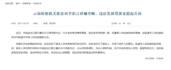 据最高人民检察院官网消息,近日,中国进出口银行重庆分行原党委书记、行长李泊言涉嫌受贿罪、违法发放贷款罪一案,经最高人民检察院指定管辖,由昭通市人民检察院依法向昭通市中级人民法院提起公诉。