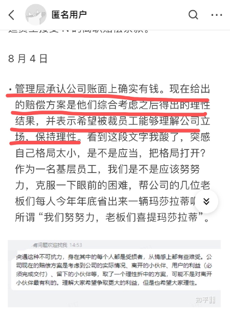 有网友在知乎爆料称:有同事发现,公司在大规模裁员的同时仍在面试新员工,且公司账面上的钱完全足以支付员工的补偿金,后来管理层也承认公司账面上确实有钱,现在给出的赔偿方案是他们综合考虑之后得出的理性结果,并表示希望被裁员工能够理解公司立场。