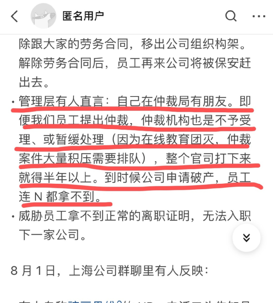 不接受单n赔偿的员工也大有人在,当协商未果大家提出要进行劳动仲裁时,上述爆料人称,豌豆思维的领导扬言自己在仲裁局有朋友,即使提出仲裁也会被搁置,最终连n都拿不到。