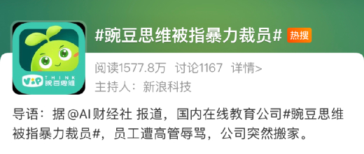 话题#豌豆思维被指暴利裁员#甚至登上微博热搜,引来一千多万网友围观。甚至小红书上、知乎上也有大量控诉豌豆思维的帖子。