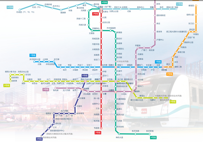 目前,西安共有1号线、2号线、3号线、4号线、5号线、6号线、9号线、14号线八条地铁线运营,串起了西安主城区和周边大部分商业街区、人员密集区及旅游风景区,在古城西安旅游,乘坐地铁看风景,已经成为一大时尚。