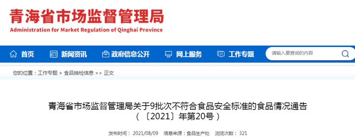 中国质量新闻网讯 近期,在青海省市场监管局组织开展的2021年青海省食品安全监督抽检中,检出9批次不符合食品安全标准的食品。其中检出不合格方便食品1批次,具体信息如下: