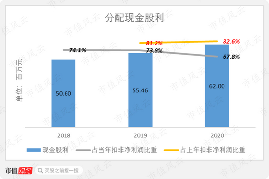 过去3年,公司分红力度较大。2019年和2020年,公司分别分配了5546万元和6200万元的现金股利,分别占上一年扣非净利润的81.2%和82.6%。