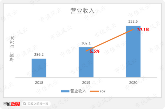 2018-2020年,公司营业收入从2.86亿元增长至3.33亿元,期间CAGR(年均复合增长率)为7.8%。