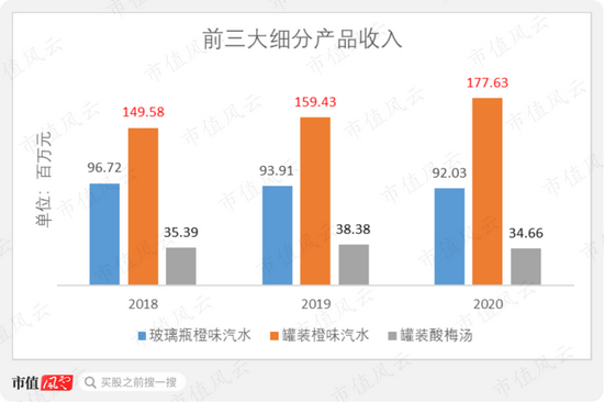 更值得担忧的是,公司的前三大细分产品中,仅有罐装橙味汽水每年仍在保持营收增长,玻璃瓶橙味汽水和罐装酸梅汤分别自2019年和2020年起出现营收下滑。