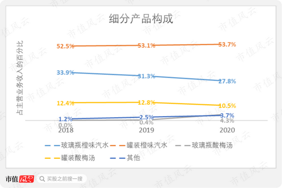 2020年,罐装橙味汽水和玻璃瓶橙味汽水分别占主营业务收入的53.7%和27.8%,橙味汽水类合计占比高达81.5%。