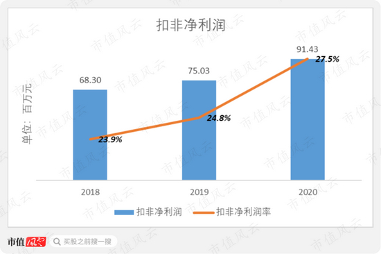 2020年,公司的扣非净利润为9143万元,较去年同期增长21.9%;扣非净利润率为27.5%,较去年同期提升2.7个百分点。