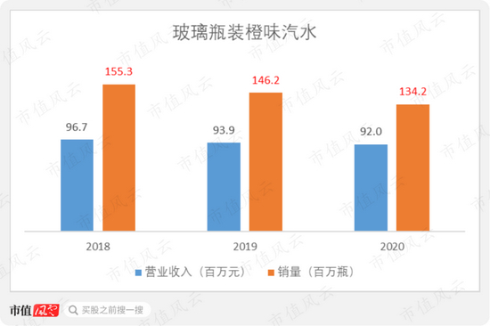 风云君上文已经指出,2018-2020年,公司主要的自产产品玻璃瓶装橙味汽水的营收和销量均一路出现下滑。