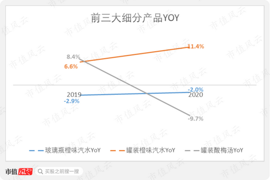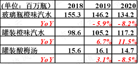 2020年,罐装橙味汽水营收同比增长11.4%,玻璃瓶橙味汽水和罐装酸梅汤的营收则分别下滑2.0%和9.7%。