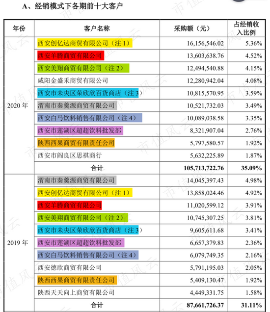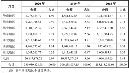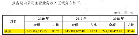 2018-2020年,公司80%以上的收入来自陕西地区。全国其他地区,如华南、华北、华中、华东等各市场的收入贡献百分比仅为个位数。