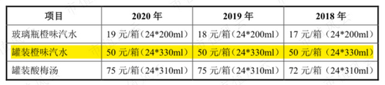 罐装橙味汽水近3年的出厂价格稳定,为50元/箱,每箱规格为24罐。