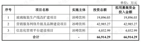 公司拟募资金额6.70亿元中,计划4.30亿元用于营销服务网络升级及品牌建设项目,1.99亿元用于玻璃瓶装生产线改扩建项目,4032万元用于信息化管理平台建设项目。