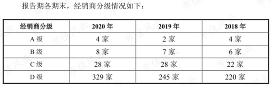 截至2020年末,公司共有369家经销商,其中D级经销商(年采购额低于200万)占89.2%,后者2018-2020年以22.3%的CAGR增长,是公司增长最快的经销商类别。