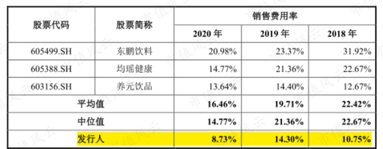最直观的区别,就是销售费用率,它是影响包装饮料行业盈利能力的最大因素,也是公司与这三家可比企业的最大差异。
