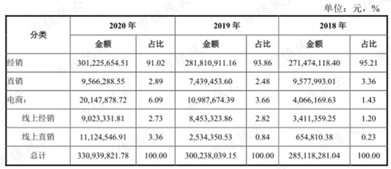 2018-2020年,公司每年90%以上的收入来自经销渠道。