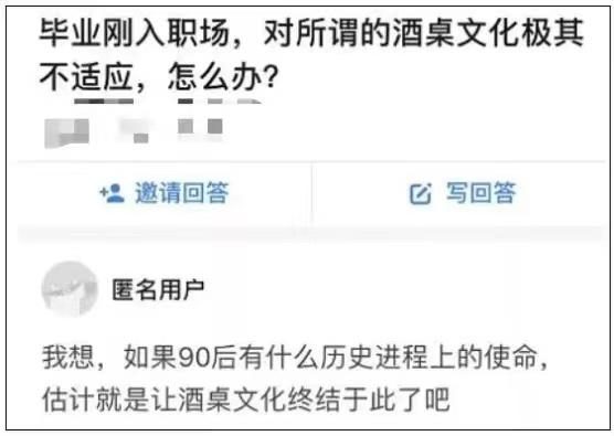 某社交平台上的一个高赞回答反映了不少人的心声:“如果说90后有什么推动历史进程的使命,估计就是让酒桌文化终结于此了吧。”