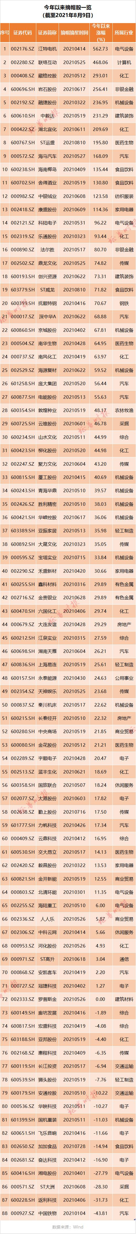 据证券时报统计,在今年摘帽的88只股票中,共有71只个股上涨,上涨比例为80.68%。涨幅在50%以上的有12只,分别为江特电机(562.73%)、联络互动(468.06%)、藏格控股(293.01%)、岩石股份(256.41%)、融捷股份(236.95%)、中毅达(231.29%)、湖北宜化(209.69%)、ST运盛(195.80%)、海马汽车(168.09%)、海南椰岛(135.44%)、舍得酒业(130.80%)、中银绒业(123.58%)、康盛股份(114.36%)。