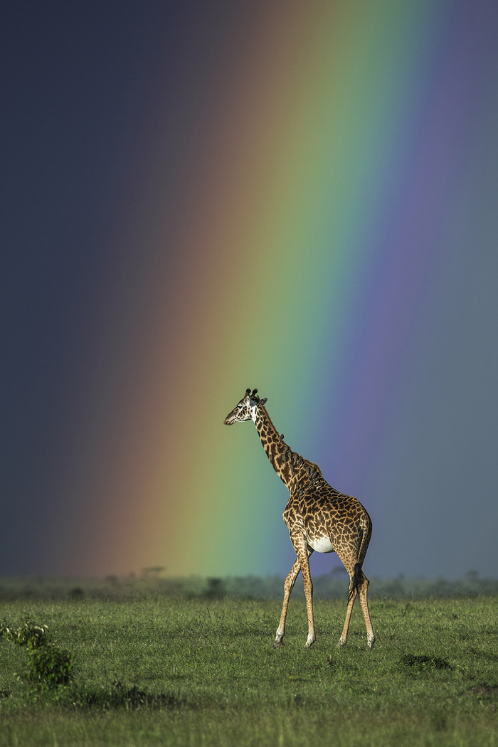 2021年8月8日报道,肯尼亚马赛马拉,职业摄影师Jayanth Sharma用镜头记录下一只长颈鹿走在彩虹之下。