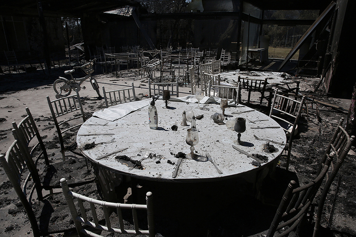 当地时间2021年8月8日在希腊首都雅典市郊的瓦里博比地区拍摄的被山火烧毁的餐厅。希腊当局警告称,包括雅典和克里特岛在内的许多地区,发生更多火灾的风险仍然很高。