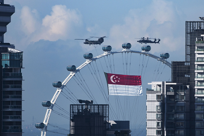 当地时间2021年8月9日,悬挂新加坡国旗的直升机在新加坡参加国庆庆典检阅礼。新加坡9日举行国庆庆典检阅礼,庆祝独立56周年。